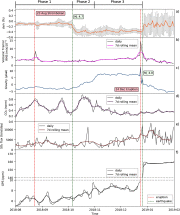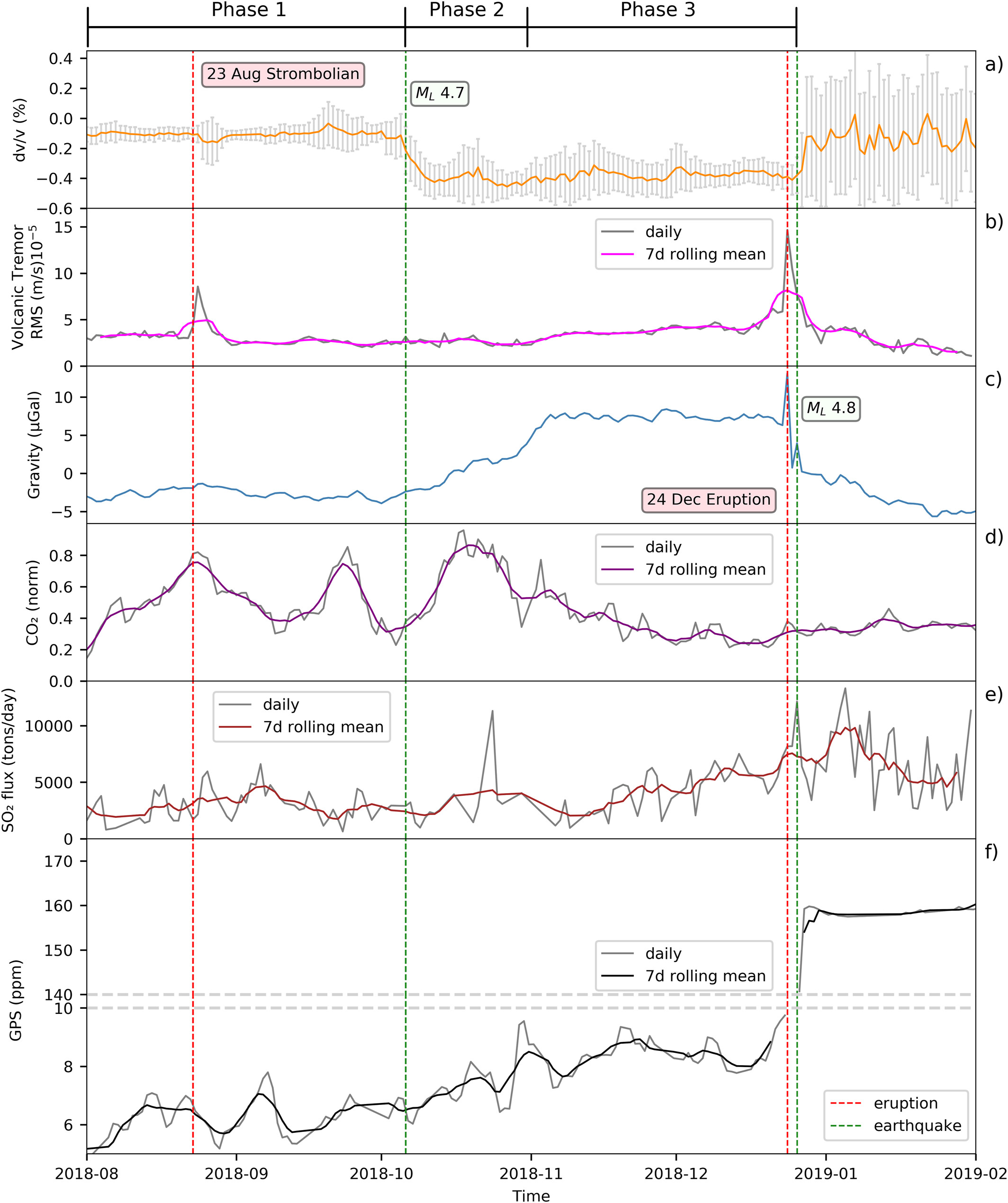 (a) Average velocity variation of 5-day moving window (dv/v) for all station pairs with its uncertainty (gray error bars). (b) Root Mean Square amplitude of volcanic tremor in velocity (m/s) filtered in the frequency band 0.5–2.5 Hz. (c) Gravity signal observed at SLN station (iGrav#16). (d) Normalized CO2 flux from the volcano flanks, measured by the EtnaGAS network. (e) The SO2 flux measured via FLAME network. (f) The areal strain of the summit area calculated using the EPLU, EPDN, ECPN, and EINT GNSS stations. The vertical dashed red lines show the 23 August Strombolian and 24 December eruption. The dashed green lines indicate the 6 October 2018 ML 4.7 and 26 December 2018 ML 4.8 earthquakes. |