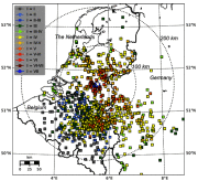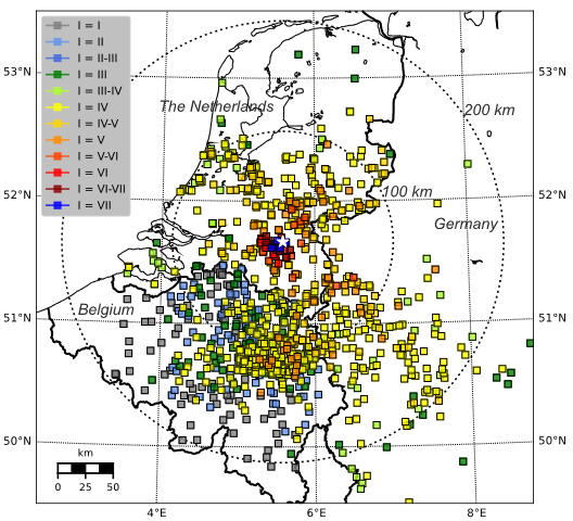 Macroseismic intensity map of the 1932 Uden earthquake including Dutch and Belgian IDPs according to EMS-98 and German IDPs according to MSK-64. The macroseismic location is indicated by a white star. Radii of 100 km and 200 km from the source are indicated as dashed lines. |
