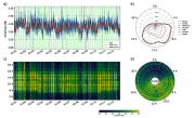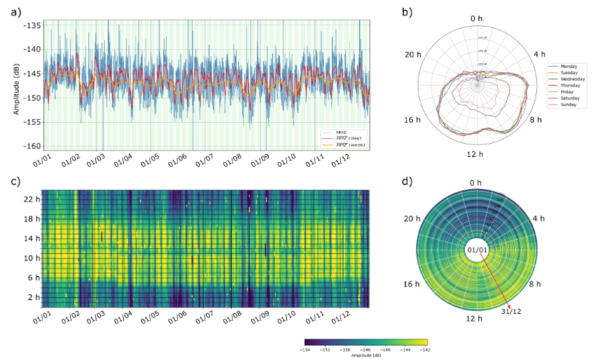 Graphical representations of the time variations of the power of the seismic acceleration amplitude for the 1.0-10.0Hz frequency band at station CCAS. Power amplitudes are expressed in dB, relative to 1 m2/s4/Hz. (a) RMS of the poweramplitude calculated every 30 minutes (blue line), averaged daily (red line) and averaged weekly (orange line). (b) Power amplitude variation averaged for each day of the week and represented as a function of the hour of the day. (c) Power amplitude variation, represented using a color palette, as a function of the hour of the day. (d) Idem, but represented in a circular graph. |
